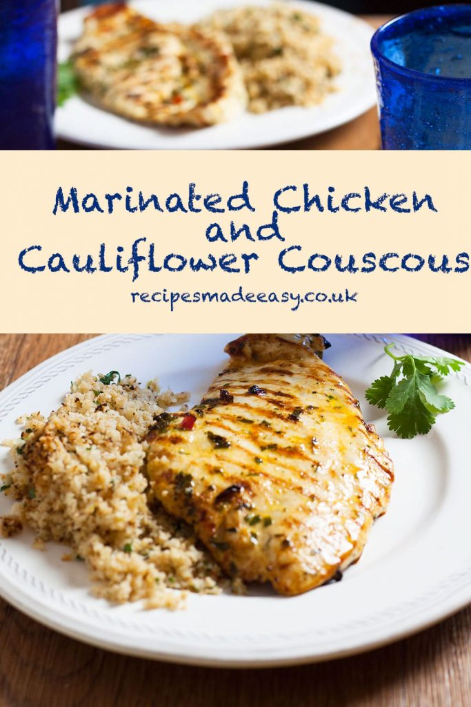 Marinated chicken with cauliflower couscous is low in fat and carbohydrates but high in flavour. Both the marinade for the chicken and the cauliflower couscous are flavoured with lime and coriander which brings a refreshing zingy flavour to the dish.