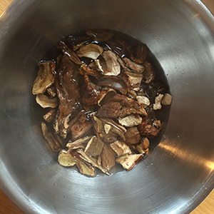 • Place the dried mushrooms in a heatproof bowl and cover with 150ml boiling water. Allow to stand for 15 minutes, then remove from the water with a draining spoon and slice.
