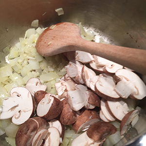 • Heat 25g of the butter with the oil in a large pan. Add the onion, and cook gently until it has softened. Stir in garlic and sliced chestnut mushrooms. Cook gently for 5 minutes until the mushrooms have softened.