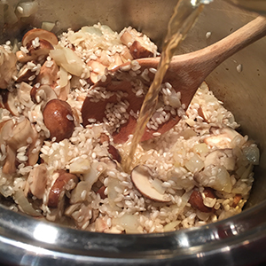 • Add the rice and cook for 2 – 3 minutes until very hot. Add the wine (if using) or your first ladleful of stock and stir until the liquid has evaporated.