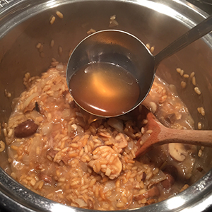 • Continue to add the stock a ladleful at a time and cook over a medium heat stirring until the stock has evaporated before adding the next ladleful.