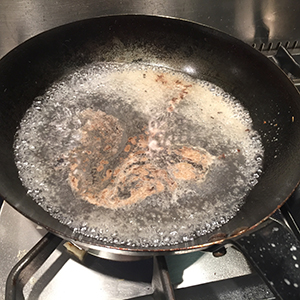 - Add the wine to the pan and stir well. Boil rapidly for a few minutes until reduced to about 4 tbsp.