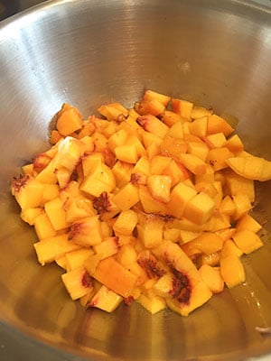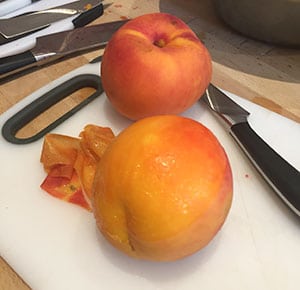 - Place the peaches in a bowl over a pan with boiling water and allow to stand for about 5 minutes. Remove from the water and remove the skin. Cut in half and discard the stone. Then chop the flesh into small pieces.