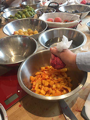 After the introduction, we set about in pairs making our own small batches of jam. Surrounded with some fabulous fruit and flavourings to choose from I was in my element. Partnered with an old friend Ann we set about making our peach and pomegranate jam. The flavour is subtle but delicious and a little lime gives it a little bit of acidity which helps balance the flavour. Cinnamon and cardamon completes the flavours.