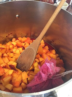 - Place the chopped peaches into in a large heavy based pan. Line a sieve with a piece of muslin and place over the pan. Cut the pomegranate in half. Scoop out the seeds and juices and strain through the sieve. Once you have strained the juice gather up the muslin and squeeze out as much juice as possible. Open the bag of muslin and pop in the cardamon pods and cinnamon. Tie up with a piece of string and add to the pan.