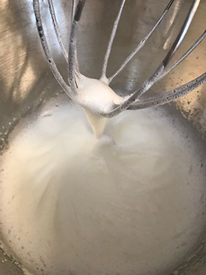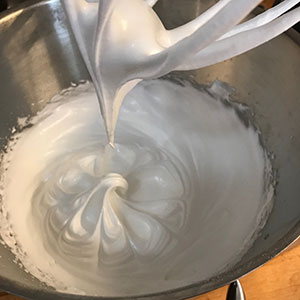 • Whisk the egg whites in a large mixing bowl until standing in stiff peaks. Gradually whisk in the sugar a tablespoonful at a time and continue whisking until you have a thick glossy meringue.