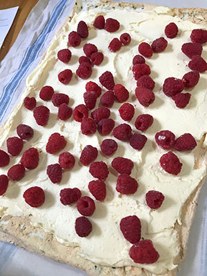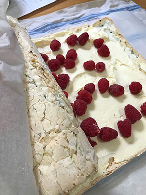 • Spread the raspberries evenly over the cream. Roll up the meringue starting at one of the short sides using the parchment and teatowel to help you.  Carefully transfer to serving plate and serve with extra berries and a few chopped or shredded nuts if desired