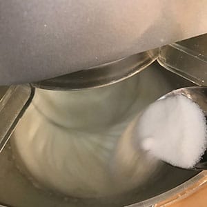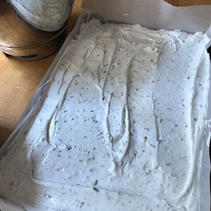 • Sprinkle the cornflour, vinegar and ground nuts over the surface of the meringue and gently fold in.  Tip into the lined tin and spread level.