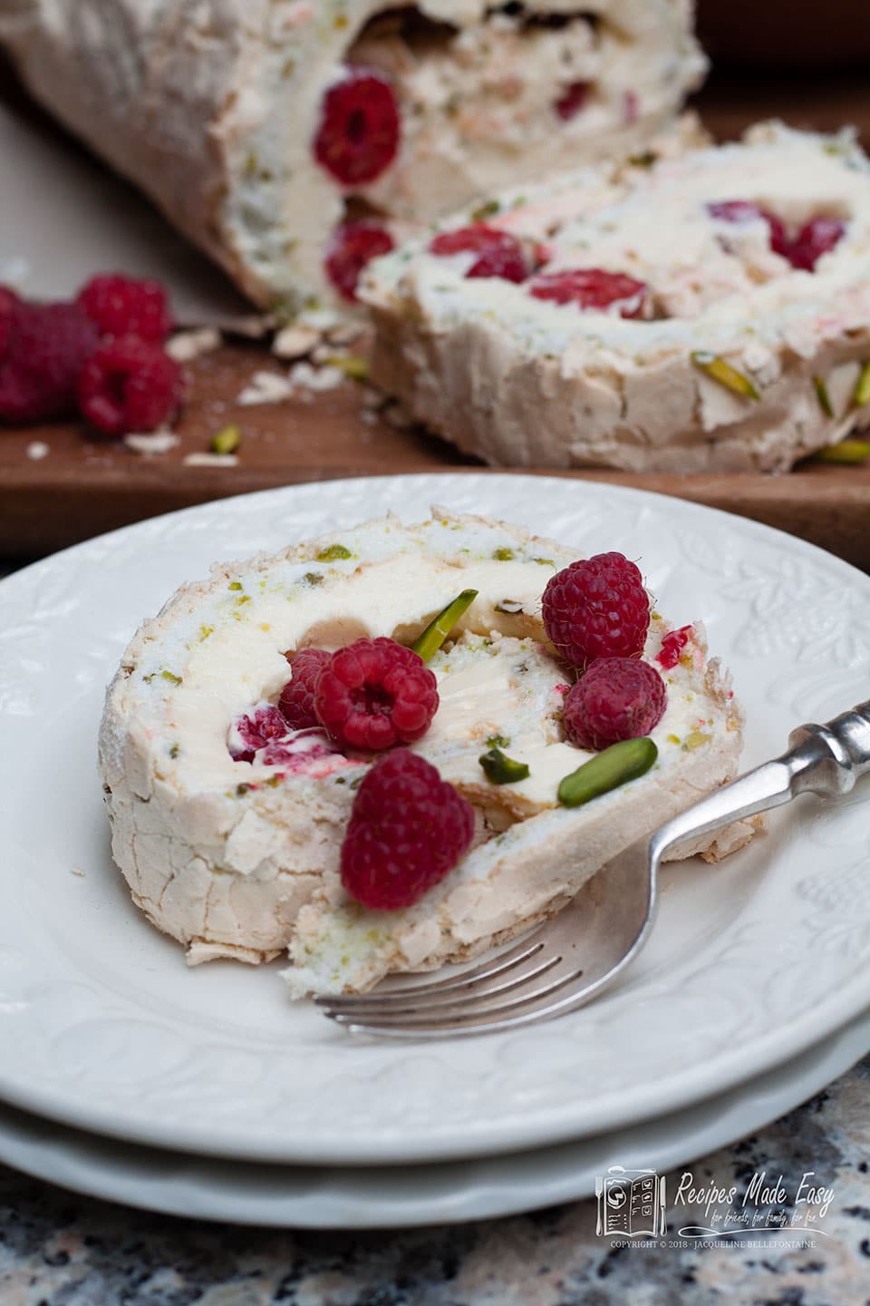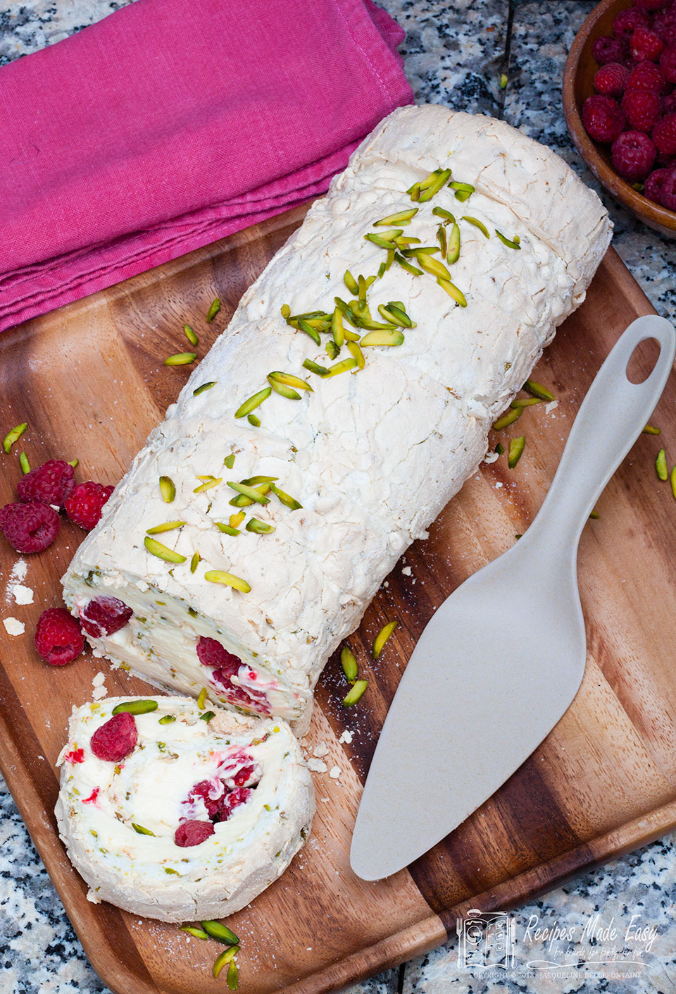 A delightful summer dessert. Pistachio, raspberry and lemon meringue roll – Soft gooey pistachio meringue rolled with a lemon cream and fresh raspberries.
