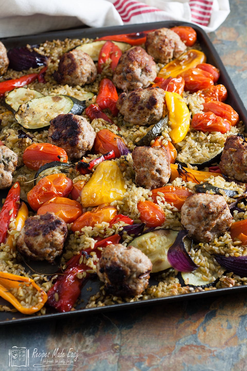 I usually serve meatballs with a sauce and when I first made this recipe I was a little concerned that it would be on the dry side but with the extra roasted vegetables if was fine and not in the least bit dry. However, I am tempted to try it next time with my really easy yogurt sauce, not because I think it needs it but because I think the flavours would go quite well together.