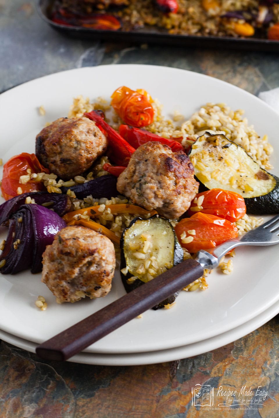 Pork, Lemon and Thyme Meatballs with Roasted Veg and Freekeh