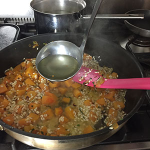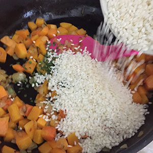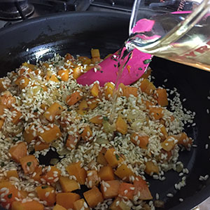 - Add the rice to the pumpkin and cook stirring for a minute or two and then add the white wine. Stir until the the wine has been adsorbed.