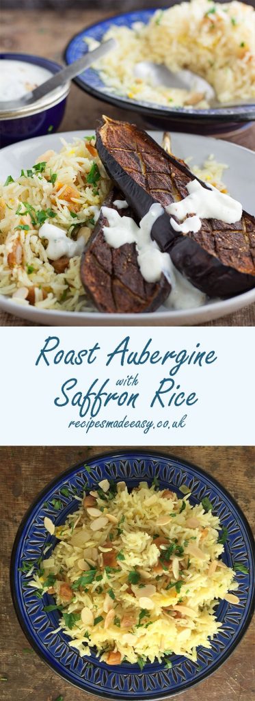 To turn this dish into a complete meal, I have served the roasted aubergine with saffron rice. The rice cooks while the aubergine is roasting so you can have a meal on the table in less than an hour with very little hands on prep which makes it a simple meal for after work.