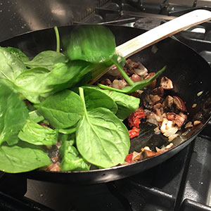• Add the mushrooms and sauté for 3-4 minutes until softened then add the sun-dried tomatoes and spinach. Stir over the heat until the spinach wilts.