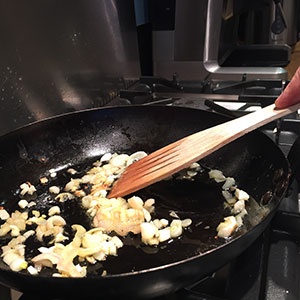 • Heat the oil and butter in a frying pan and add the shallots. Sauté for 2 to 3 minutes until softened then add the garlic.