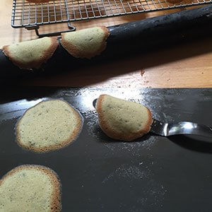 • Repeat with the remaining batter alternating the baking sheets to allow them to cool a little, to make about 10-12 tuiles.