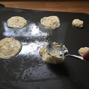 • Place 4-6 small spoonfuls of the mixture (i used a teaspoon) well spaced on a baking sheet and spread the mixture out to form 5cm/2in circles.