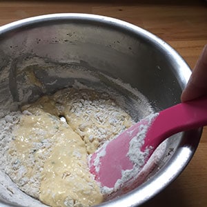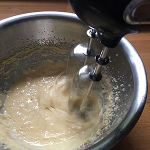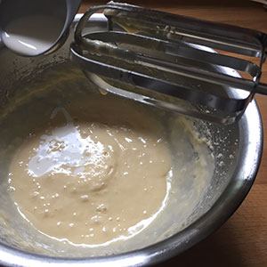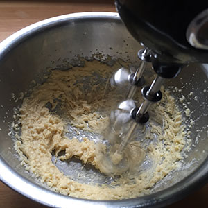 • Beat the butter and sugar together until pale and fluffy, then add the egg and beat well. Stir in the cream then sift in the flour and fold in.