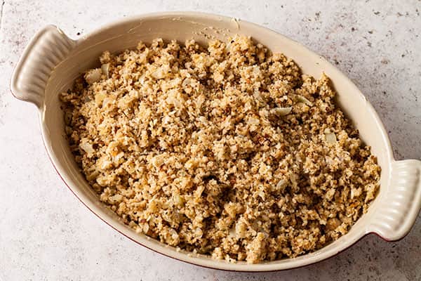 Despite its name, I prefer to serve this stuffing baked separately, rather than stuff the meat itself as I like all the lovely crispy bits you get cooking it this way. But it works well both ways so it is really a matter of personal preference.