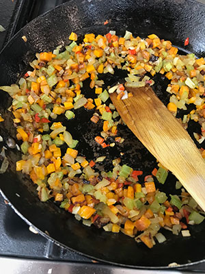- Heat the oil and fry the onion, celery, garlic and chilli, gently for 5 minutes until softened.