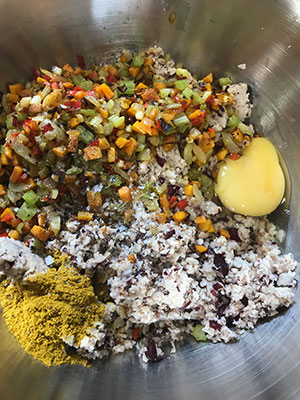 - Add the onion mixture, curry powder, and egg, and season well with salt and pepper.