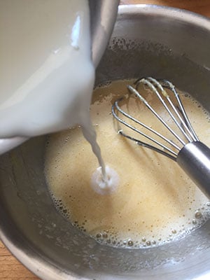 Heat the milk, then pour the hot milk onto the egg mixture stirring as you do so.