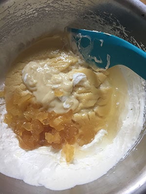 Fold in the cold custard, chopped ginger and ginger syrup.
