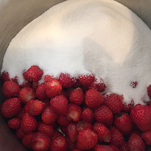• Wash the strawberries and allow to dry, then hull. Place in a preserving pan or large saucepan and add the sugar.