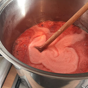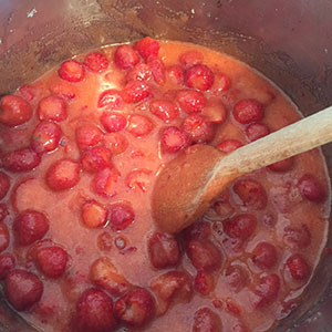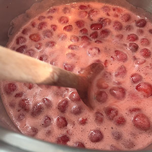 • If you have time, mix the strawberries and sugar together in the pan the night before. This will help keep the strawberries whole during cooking. That said, I quite like a mixture of whole fruit and fruit pieces. I break my fruit up a bit either by prodding it with a wooden spoon or with a potato masher (quicker but easier to over mash). I aim for about 50% broken fruit and 50% whole.