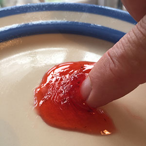 To test for set – Chill a couple of saucers before you start. After about 5 minutes boiling turn off the heat. Place a small amount of jam on the chilled saucer and allow to cool for a minute or two. Gently push with your finger tip. If the surface crinkles then setting point is reached. If not return the mixture to the boil and boil again for a further minute or so then test again. Repeat until setting point is reached