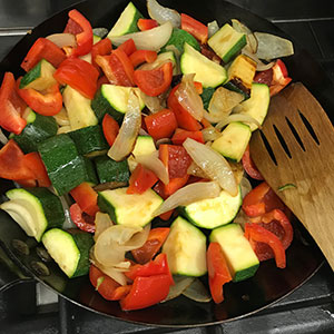 • Add the pepper and courgette and continue to cook stirring occasionally for about 5 minutes until just softened and just beginning to colour.