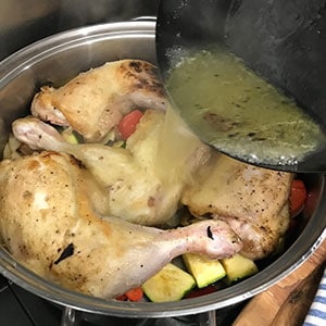 • Add the chicken to the pan adding the remaining oil. Brown the chicken for 2 to 3 minutes each side. You may find this easier to do in two batches. Transfer the chicken to the casserole