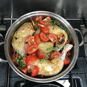• Add the tomatoes and thyme to the pan, cover and simmer gently for 20 to 25 minutes or until the chicken is cooked through.