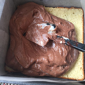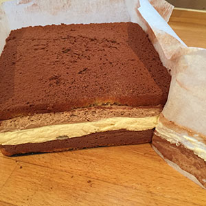 - Layer the chocolate mixtures into the tin on top of each other and spread level. Top with the remaining sponge cake and chill in the refrigerator for several hours.