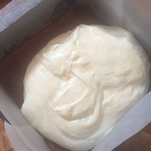 - Next fold the white chocolate into another portion of the custard. Whisk another egg white into soft peaks and fold in. Pour into the tin and spread level. Pop into the freezer for 10 minutes.