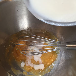 - Heat the milk in a saucepan and bring to the boil. Pour onto the egg yolk mixture whisking as you do so. place the bowl over a pan of simmering water and cook stirring until thickened slightly.