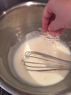 It is a good idea to take the cream out of the fridge a little ahead of time so that it isn't so cold that it starts to set the custard as soon as it is added.